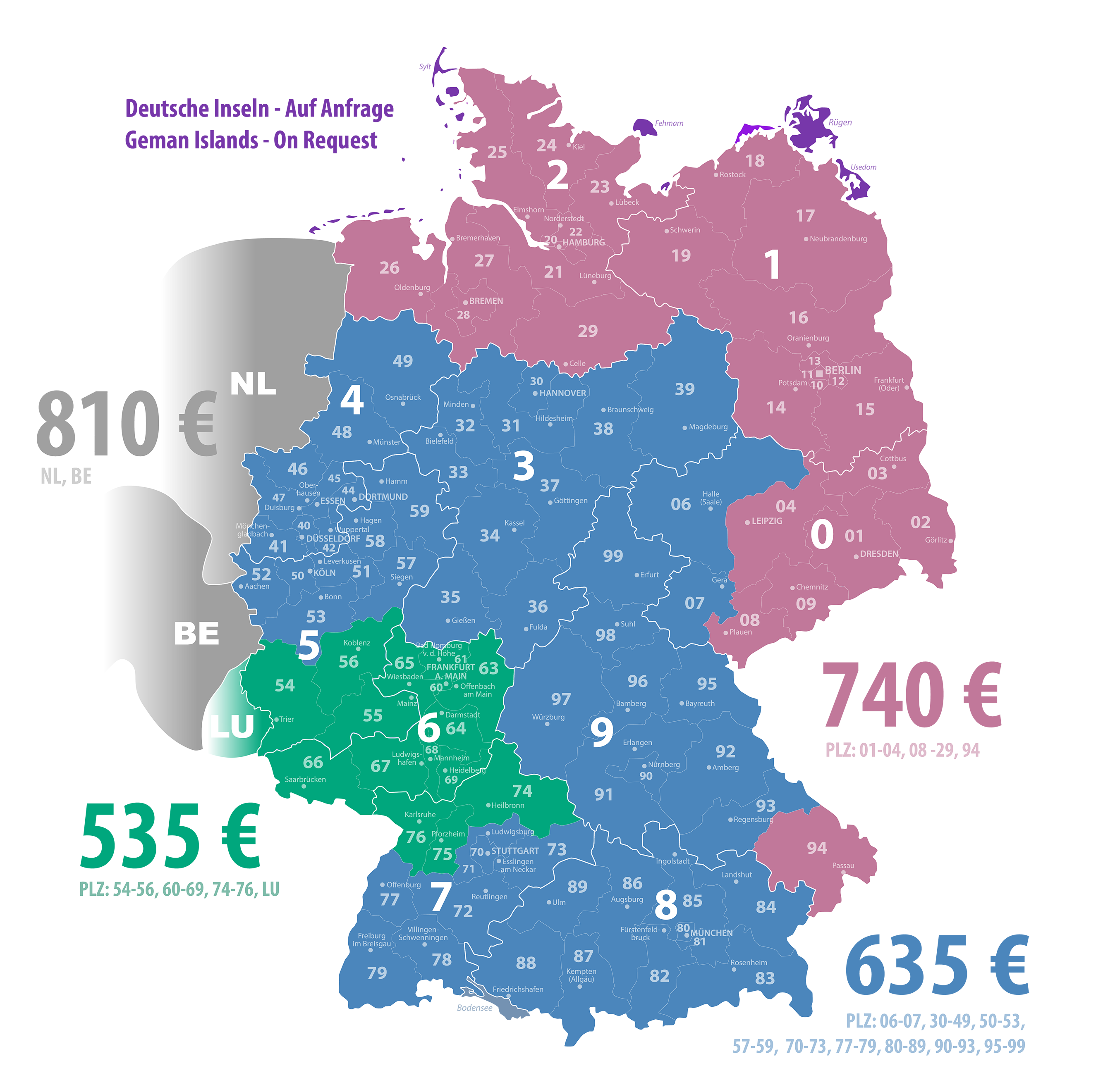 | Deutschland - (5 bis 40 Werktage) 660,00 € : PLZ: 54-56, 60-69, 74-76, LU 760,00 € : PLZ: 06-07, 30-49, 50-53, 57-59, 70-73, 77-79, 80-89, 90-93, 95-99 860,00 € : PLZ: 01-04, 08 -29, 94 Lieferung auf Inseln nur bedingt möglich, bitte kontaktieren Sie uns. | ab 660,00 € |
